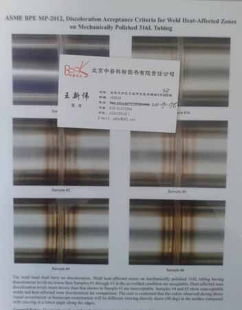 进口版ASME BPE EP-2012 DISCOLORATION ACCEPTANCE CRITERIA FOR WELD HEAT-AFFECTED ZONES ON ELECTROPOLISHED 316L TUBING